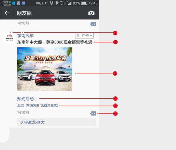 朋友圈图文广告由 五或六个部分 的内容构成,包含广告主头像&名称、外层文案、外层图片、文字链、用户社交互动等, 本地推广图文广告还包括门店标识 。