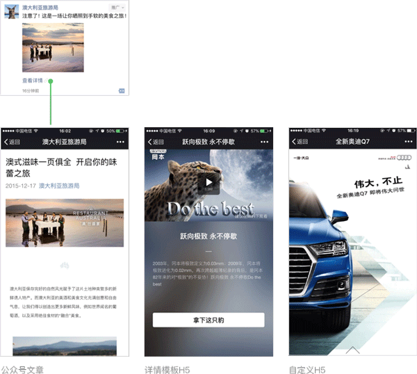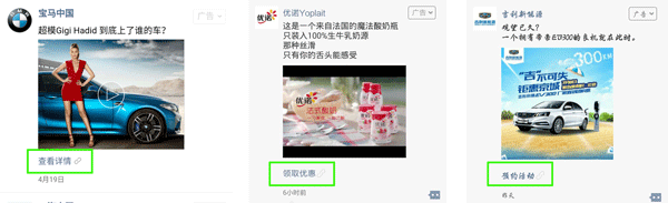 支持“图文”和“视频”的广告形式,点击文案可配置“查看详情”和“领取优惠”、“预约活动”等,点击后跳转模版详情页、公众号图文消息和自定义H5页面,满足品牌曝光、产品/活动页推广等推广诉求。