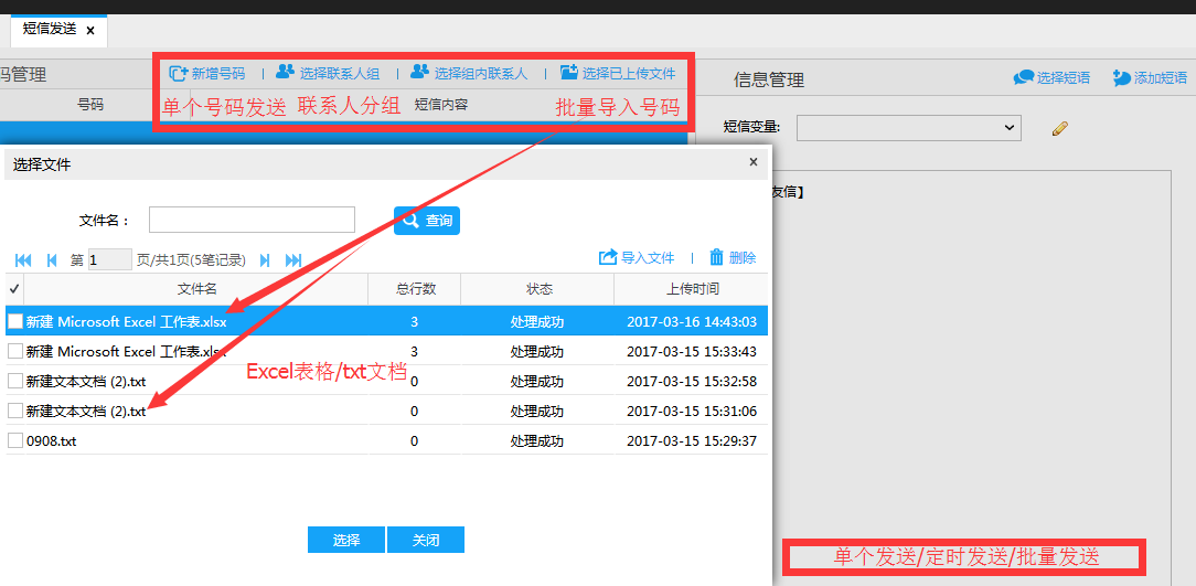 进入短信发送页面,可以发送,我们既可以单发短信,也可以批量导入号码进行发送,还可以对批量导入的号码进行分组、分类,非常简单,在页面的右侧需要输入短信内容,也可以插入变量哦,变量如“姓名”“年龄”“工资”等等。编辑好短信内容即可选择发送方式:测试发送/预约发送/正式发送等。如图