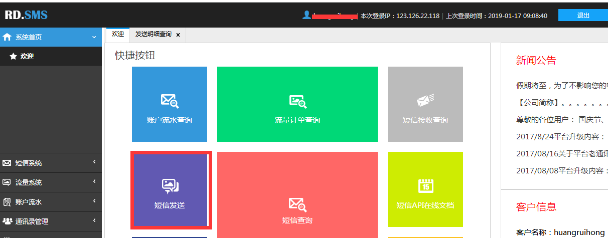 登录已经注册好的友信云短信平台,在系统首页选择,短信发送,