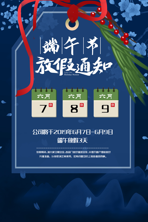 根据国家节假日放假规定,我公司决定,现将2019年端午节放假事项通知如下: 一、端午放假时间定为6月7日至6月9日,共3天; 二、请各部门安排好值班事宜; 三、为避免耽误您对平台的正常使用,请您提前联系客户经理做好充值安排。 最后祝您端午快乐!